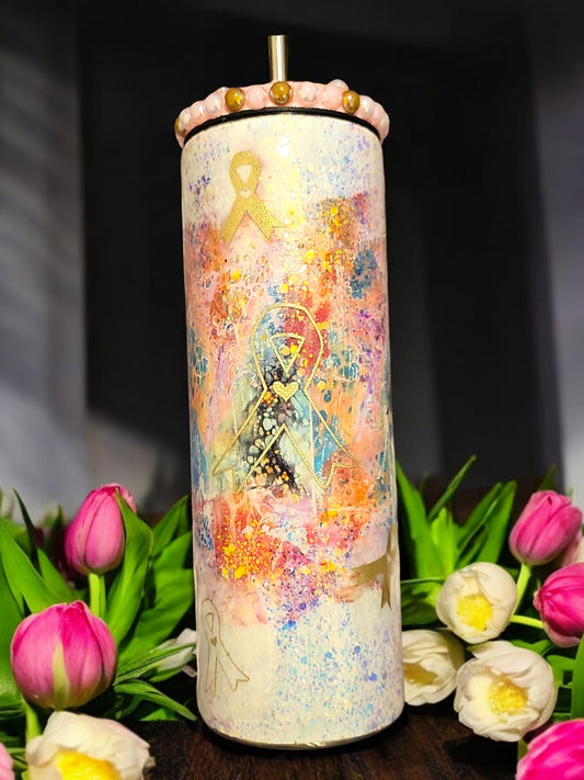 FIGHT Survivor - Foil Paint Pour Mug + Rhinestones & Pearls Screw Lid [20oz]